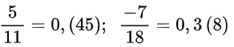 Bài 2 trang 29 Toán lớp 7 Tập 1: Viết mỗi phân số sau dưới dạng số thập phân vô hạn tuần hoàn (dùng dấu ngoặc để nhận rõ chu kì): 5/11; -7/18