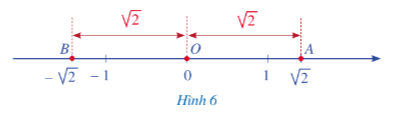 Gọi A là điểm (nằm bên phải điểm gốc 0) biểu diễn số thực √2 trên trục số nằm ngang. Gọi B là điểm nằm bên trái điểm gốc 0 sao cho OA = OB (điểm O biểu diễn điểm gốc 0). Khi đó, điểm B biểu diễn một số thực, kí hiệu là −√2 (Hình 6).